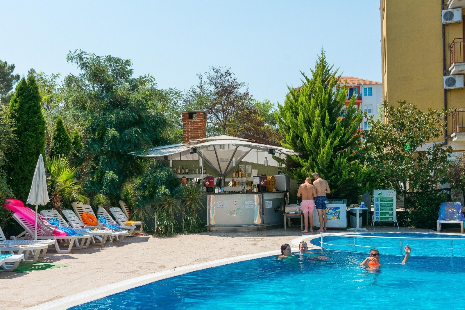 The hotel has a beautiful restaurant by the pool with indoor and outdoor area offering a great choice of bulgarian and international meals that can be ordered separately a-la-carte or with All Inclusive package!