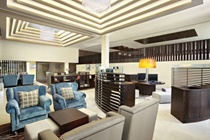 The lobby is medium in size. The hotel is traditional in design.