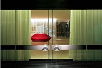 The hotel occupies a contemporary mid-rise building with a minimalist, predominantly glass and stainless steel facade.