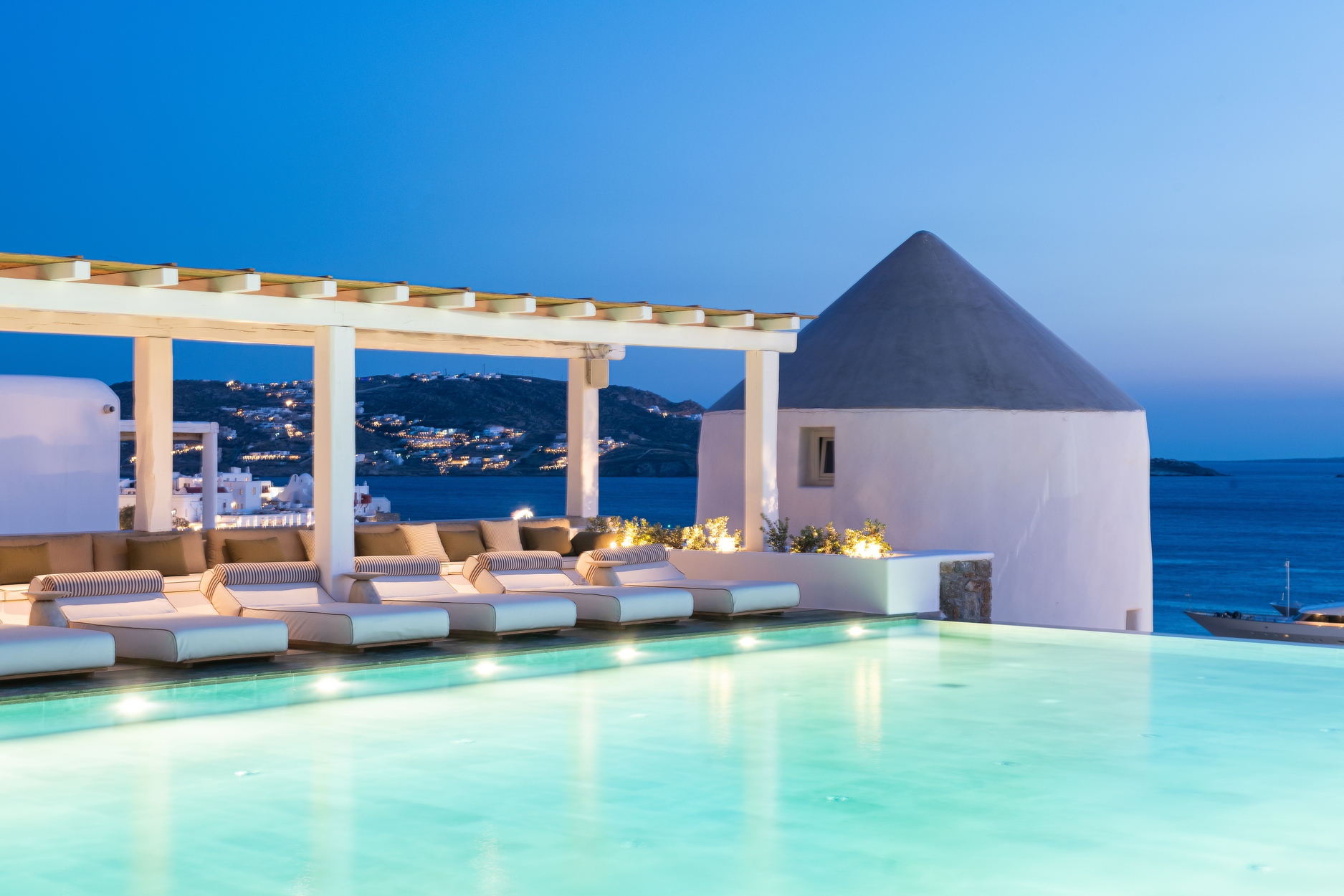 This stunning hotel boasts Cubistic Cycladic architecture and white washed walls overlooking the old port of Mykonos. Guests will be able to reach various attractions on foot, including the Aegean Mar...