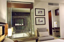 Grand Pool View rooms are decorated in a simple, modern style with dark wood furniture, artwork on the walls and floor-to-ceiling windows. They are situated on the hotel's upper floors and boast a private balcony overlooking one of the swimming pools. Amenities include air-conditioning, a flat-screen TV with on-demand content and an en-suite bathroom.