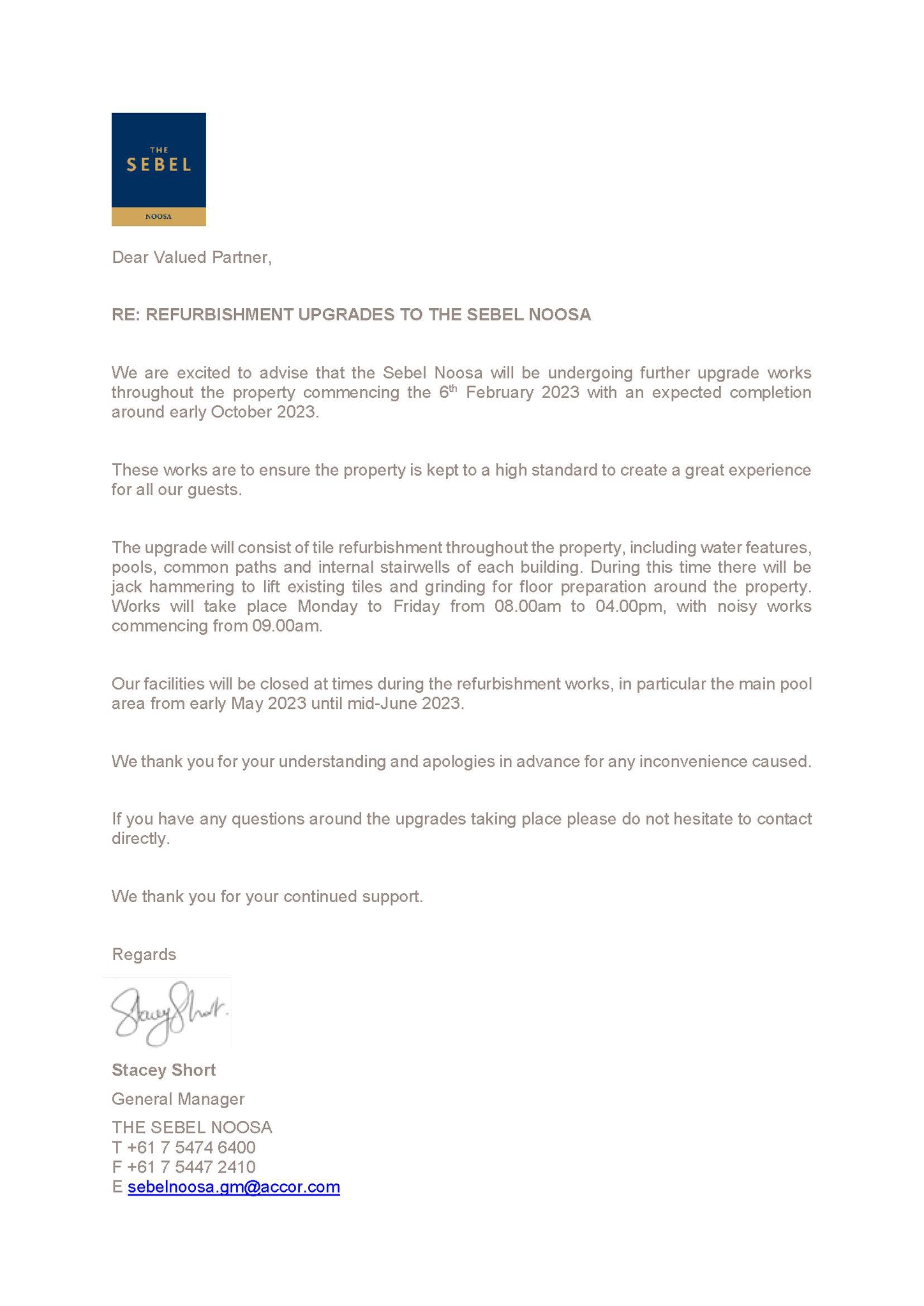 Very Good, 4Located in the heart of cosmopolitan Hastings Street, The Sebel Noosa is surrounded by world-class restaurants, cafés, and upmarket fashion boutiques, just moments from Noosa's Main Beach and the beautiful Noosa River. Perfect for couples or families, the one and two bedroom apartments feature spacious living and dining areas, separate bedrooms, cooking facilities, laundry and spa bath. Unwind on the private furnished balcony or terrace or bask on the beach. A perfect place to relax, explore and indulge. We are excited to advise that the Sebel Noosa will be undergoing further upgrade works throughout the property commencing early March 2023 with an anticipated completion around December 2023. These works are to ensure the property is kept to a high standard to create a great experience for all our guests. The upgrade will consist of tile refurbishment throughout the property, including water features, pools, common paths and internal stairwells of each building. During this time there will be jack hammering to lift existing tiles and grinding for floor preparation around the property. Works will take place Monday to Friday from 08. 00am to 04. 00pm. Our facilities will be closed at times during the refurbishment works, in particular the main pool area from late April until late September. We thank you for your understanding and apologies in advance for any inconvenience caused. If you have any questions around the upgrades taking place please do not hesitate to contact directly.