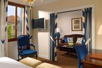 1-Bedroom Deluxe suites are 39-52sqm and decorated in luxurious, traditional blue and ivory colours with Murano glass chandeliers, elegant antiques and thick, silk fabrics. Amenities include air-conditioning, chargeable wired internet, two flat-screen satellite TVs with pay-per-view content, a mini-bar with complimentary mineral water, separate sitting area, work desk and safe. The marble en-suite bathrooms feature a bathtub with integrated shower, bathrobes, slippers and complimentary Etro toiletries.